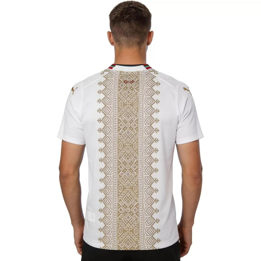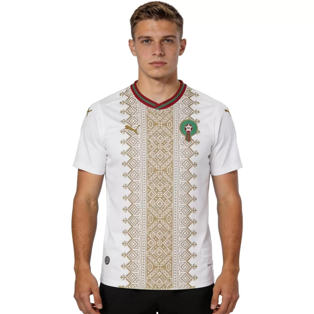Detalles de Identidad Marroquí: Base blanca con ribetes en verde y rojo que celebran la bandera nacional y la rica historia del fútbol del Magreb.