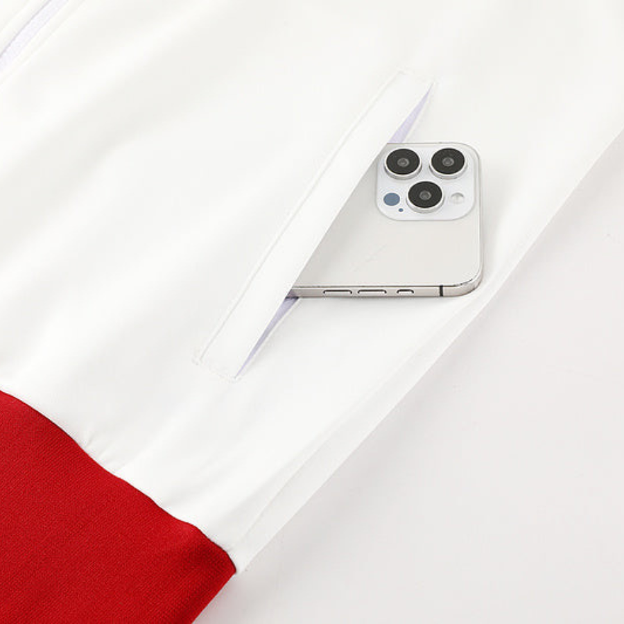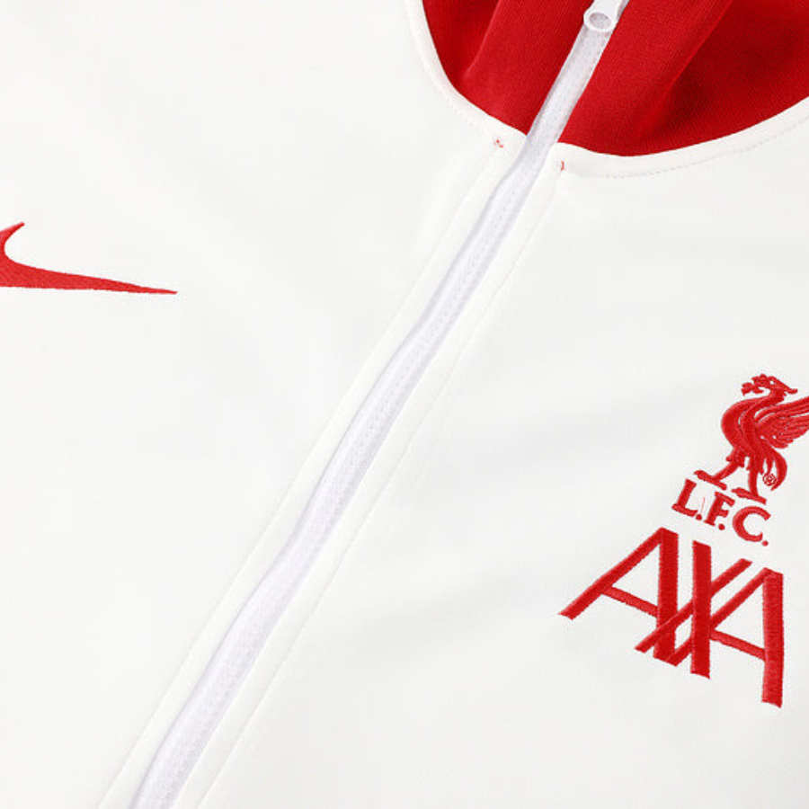 Este chándal presenta detalles como el logo de Nike y el escudo oficial de Liverpool, que le dan un toque auténtico y exclusivo a la prenda. El diseño en blanco se complementa con detalles en rojo que hacen alusión a los colores tradicionales del club. Con la chaqueta con cremallera completa y el cuello alto, este chándal ofrece un ajuste personalizable, mientras que los pantalones con cintura elástica te proporcionan libertad de movimiento en cada acción.