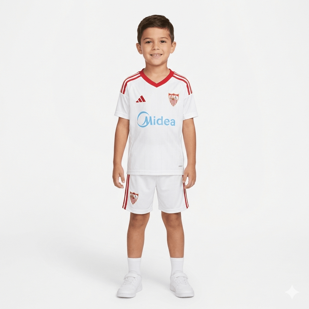 Viste a los pequeños sevillistas con la elegancia del Ramón Sánchez-Pizjuán con el nuevo conjunto oficial del Sevilla FC para niños 2026 2027. Este kit infantil completo en el icónico blanco y rojo incluye la camiseta titular y el pantalón corto a juego. Es la opción preferida para padres que buscan comprar la equipación de local del Sevilla FC para niños con máxima calidad deportiva.
